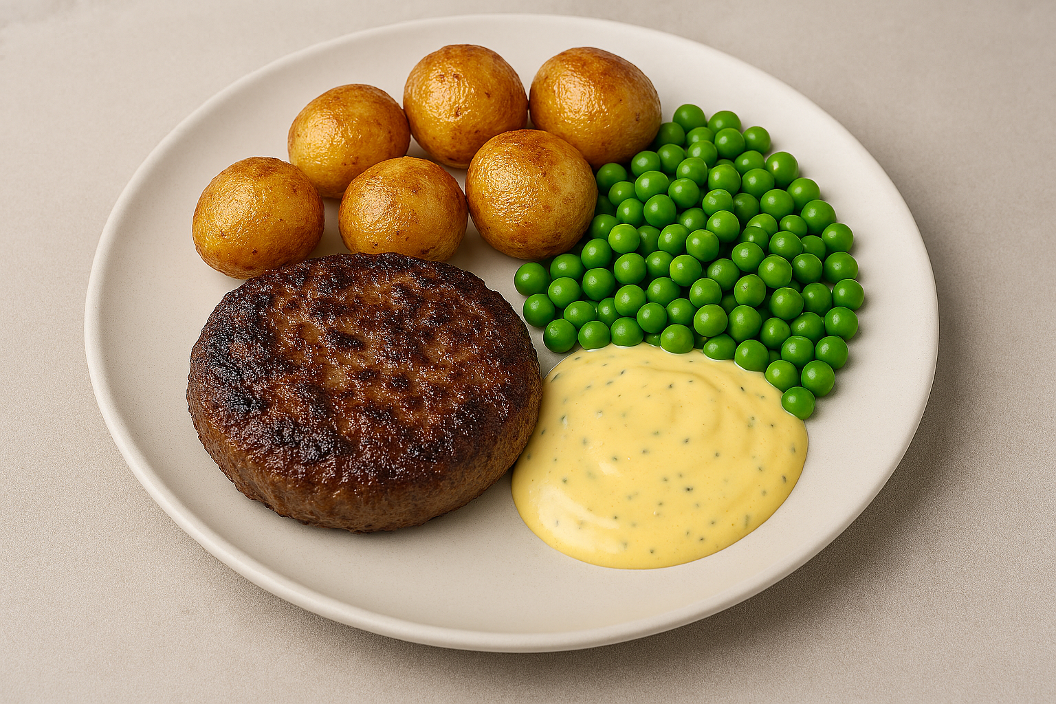 Herregårdsbøf med ovnkartofler, ærter og bearnaise - Foto lavet med AI
